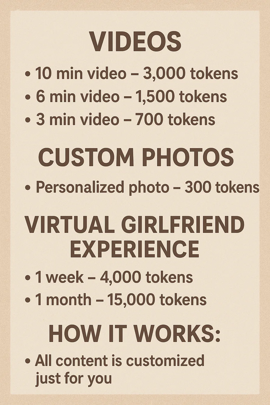 أهيجاو, في الخارج, رقص مثير, قضيب صناعي أو هزاز, تصبيع, فتيشية القدم, فاضح جدًا, تحت التنورة, صدر عارٍ, تدخين, لعب الأدوار, كلام بذئ, العادة السرية, عاشقات, مص, صفع, مداعبة بالقدم, رقص التعري, دش, ألعاب شرجية, حلق عميق, تعليمات الاستمناء, نشوة, وضعية الكلب, مداعبة يدوية, نطر كساس, كعوب عالية, رقص التويرك, إهانة, تقييم الزبر